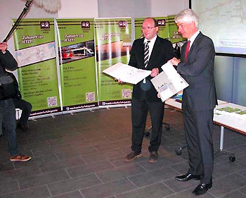 Unterschriften-Übergabe durch Martin Schlünß (links) an Staatssekretär Dr. Frank Nägele. (Foto: Holger Busche)